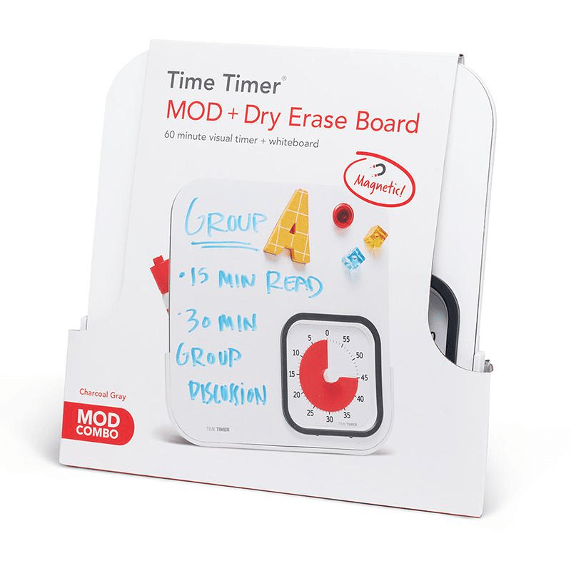 The Time Timer MOD + Dry Erase Board is a magnetic dry erase board combined with a 60-minute visual timer. The color disk on the timer and the writable dry erase surface of the desktop-sized board makes it easy to keep track of time and tasks to be completed in one place. Store supplies in built-in caddy on back. No ticking, alert optional. One-Year 100% Satisfaction Guarantee. Includes 60 minute visual timer, charcoal gray silicone MOD cover and magnetic dry erase board. MOD timer requires 1 AA/1.5V battery (not included).